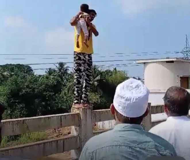 ಸ್ಥಳೀಯರ ಪ್ರಶ್ನೆಗಳಿಗೆ ಪುಟಾಣಿಯ ಹಿಡಿದುಕೊಂಡು ಸೇತುವೆ ಮೇಲಿದ್ದ ಯುವಕ ಉತ್ತರಿಸುತ್ತಲೇ ನದಿಗೆ ಹಾರಲು ಮುಂದಾಗಿದ್ದಾನೆ. ತಕ್ಷಣವೇ ಸ್ಥಳದಲ್ಲಿದ್ದ ಮುಸ್ಲಿಂ ಬಾಂಧವರು ಮಗು ಮತ್ತು ಆತನನ್ನು ಹಿಡಿದು ಎರಡು ಜೀವಗಳ ರಕ್ಷಿಸಿದ ಕಾರ್ಯ ಸಾರ್ವಜನಿಕರ ಪ್ರಶಂಸೆಗೆ ಪಾತ್ರವಾಗಿದೆ.