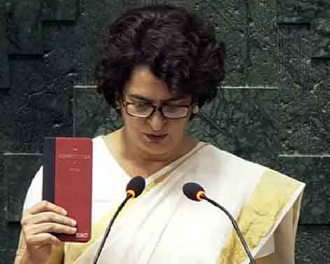 ಕೇರಳದ ಸೀರೆ ತೊಟ್ಟು, ಸಂವಿಧಾನದ ಪುಸ್ತಕ ಹಿಡಿದು ಸಂಸದೆಯಾಗಿ ಪ್ರಿಯಾಂಕಾ ಗಾಂಧಿ ಪ್ರಮಾಣವಚನ