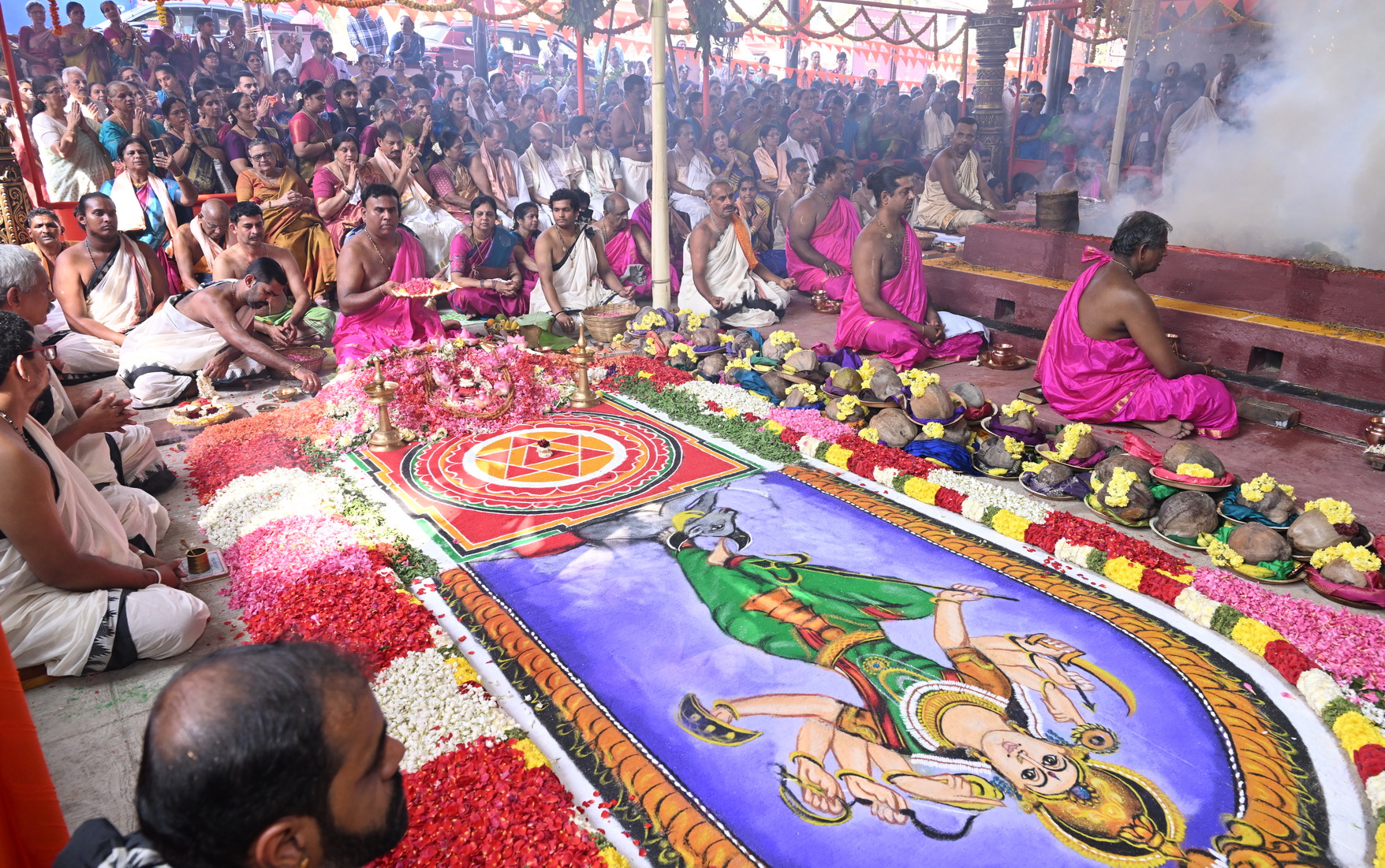 ಮುಂಜಾನೆ 6 ರಿಂದ ಸಮೂಹಿಕ ದೇವತಾ ಪ್ರಾರ್ಥನೆ, ಸಂಕಲ್ಪ ಪೂಜೆ ಯೊಂದಿಗೆ ಧಾರ್ಮಿಕ ಪೂಜಾ ವಿಧಾನಗಳನ್ನು ದೇವಳದ ತಂತ್ರಿಗಳಾದ ಕೆ.ಸ್. ಕೃಷ್ಣಮೂರ್ತಿ, ರಮಣ ತಂತ್ರಿ ಗಳು ಮಾರ್ಗದರ್ಶನದಲ್ಲಿ ನೂರಾರು ವೈದಿಕರು ನೆಡೆಸಿಕೊಟ್ಟರು.