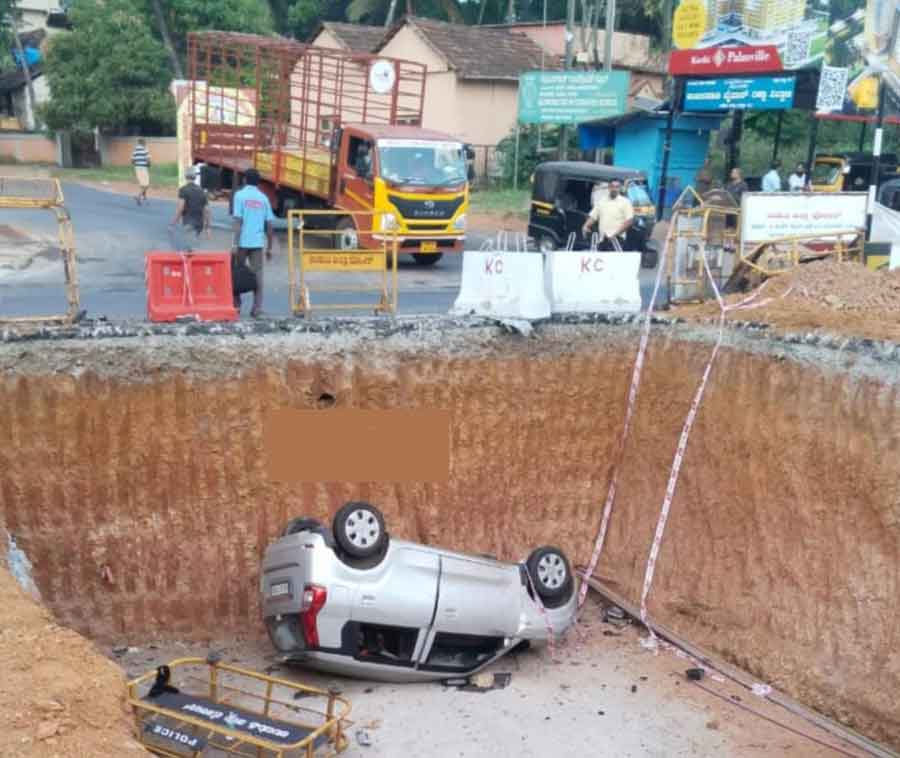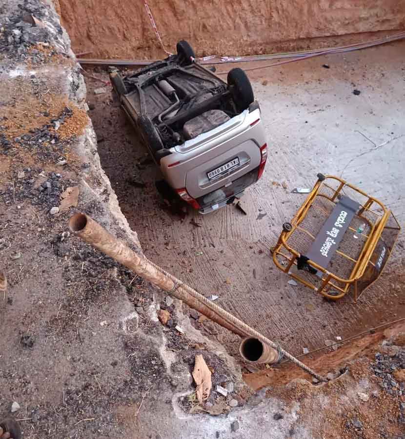 ಉಡುಪಿ: ಅಂಬಲಪಾಡಿಯಲ್ಲಿ ಮೇಲ್ಸೇತುವೆ ನಿರ್ಮಾಣ ಸ್ಥಳದಿಂದ ಪಿಲ್ಲರ್ ಅಗೆತದ ಗುಂಡಿಗೆ ಕಾರು ಪಲ್ಟಿ