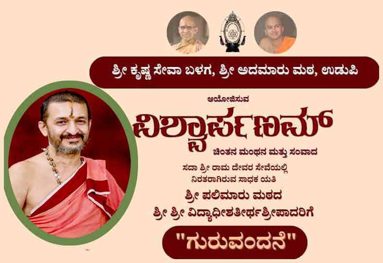 ಉಡುಪಿ: ಅದಮಾರು ಮಠದ ಹಿರಿಯ ಯತಿಗಳಾದ ಶ್ರೀ ಶ್ರೀ ವಿಶ್ವಪ್ರಿಯ ತೀರ್ಥ ಶ್ರೀ ಪಾದರ ಅನುಗ್ರಹದೊಂದಿಗೆ ಶ್ರೀ ಅದಮಾರು ಮಠದ ಕಿರಿಯ ಶ್ರೀಗಳಾದ ಶ್ರೀ ಶ್ರೀ ಈಶಪ್ರಿಯತೀರ್ಥ ಶ್ರೀಪಾದರ ಆಶಯದಂತೆ ವಿಶ್ವಾರ್ಪಣಂ 35 ರ ಕಾರ್ಯಕ್ರಮದಲ್ಲಿ ಪಲಿಮಾರು ಮಠದ ಹಿರಿಯ ಯತಿಗಳಾದ ಶ್ರೀ ಶ್ರೀ ವಿದ್ಯಾಧೀಶತೀರ್ಥ ಶ್ರೀಪಾದರಿಗೆ ಗುರುವಂದನಾ ಕಾರ್ಯಕ್ರಮವು ಜನವರಿ 4 ಶನಿವಾರ ಅಪರಾಹ್ಣ 2:30ಕ್ಕೆ ಉಡುಪಿಯ ಪೂರ್ಣಪ್ರಜ್ಞ ಆಡಿಟೋರಿಯಂ ನಲ್ಲಿ ನಡೆಯಲಿದೆ.