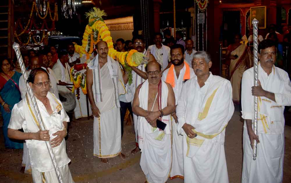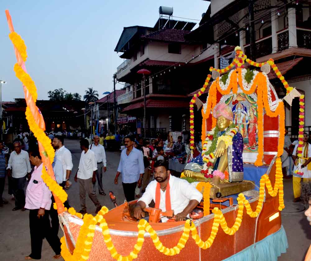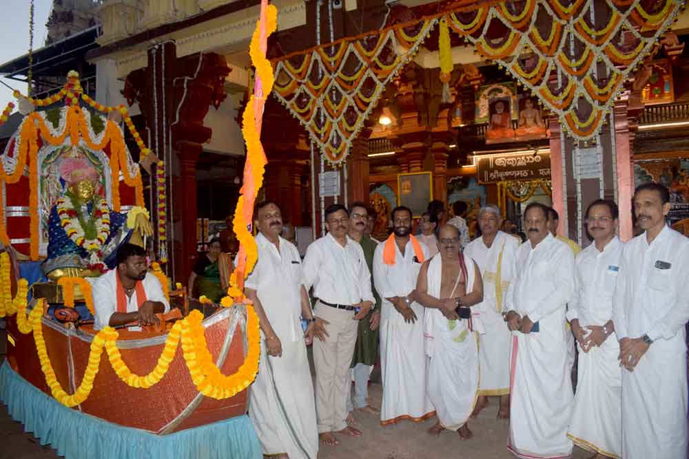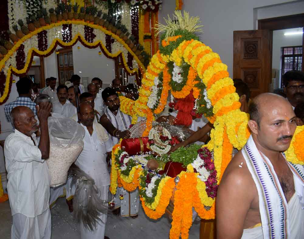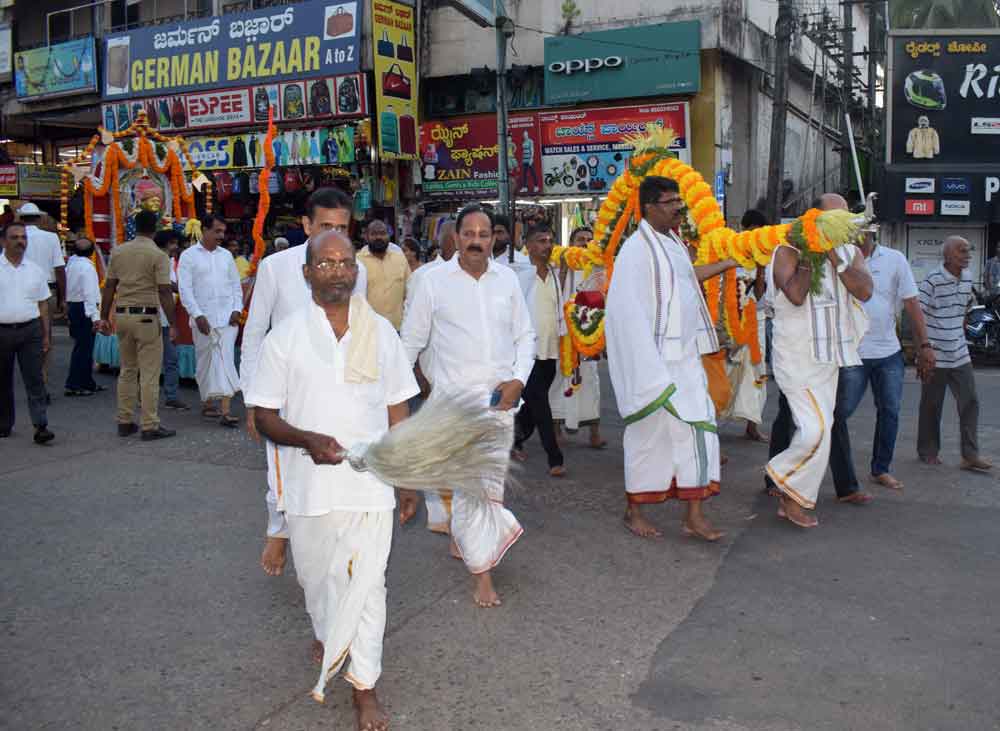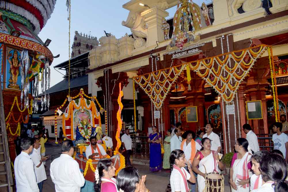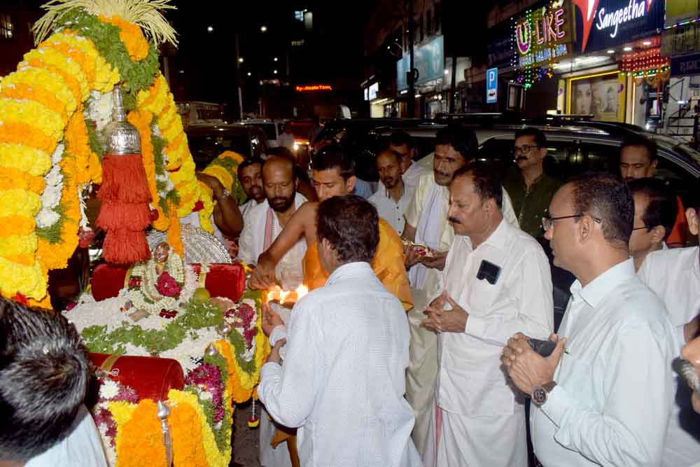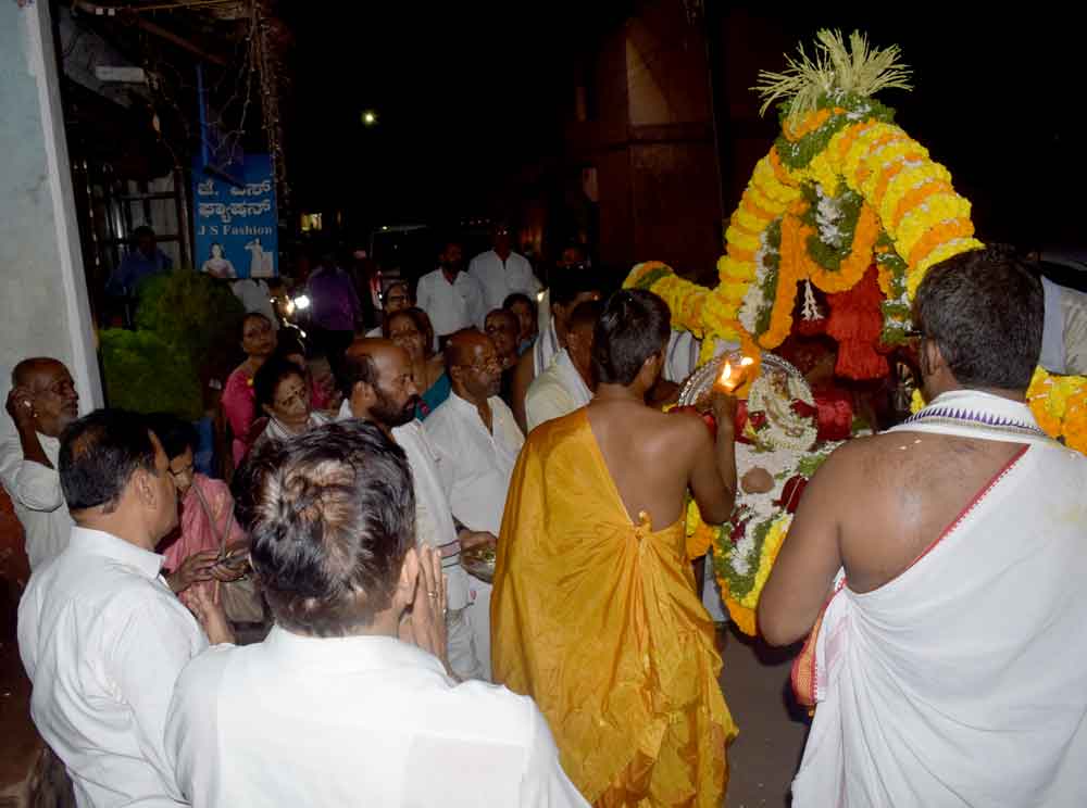 ಸಾಯ೦ಕಾಲ 4.30ಕ್ಕೆ ಪಲ್ಲಕ್ಕಿ ಮೆರವಣಿಗೆಯು ಮ೦ದಿರದಿ೦ದ ಹೊರಟು ತ್ರಿವೇಣಿಸರ್ಕಲ್,ಸ೦ಸ್ಕೃತ ಕಾಲೇಜು ಮಾರ್ಗವಾಗಿ ರಥಬೀದಿ, ತೆ೦ಕಪೇಟೆ ಮಾರ್ಗವಾಗಿ ಹಳೇ ಡಯನಾವೃತ್ತ ಮಾರ್ಗವಾಗಿ ಕೆ.ಎ೦.ಮಾರ್ಗವಾಗಿ ಸಾಗಿ ಬ೦ದು ಮ೦ದಿರ ತಲುಪಿತು.ಭಕ್ತರು ದಾರಿಯುದ್ಧಕ್ಕೂ ಹೂ-ಆರತಿಯನ್ನು ನೀಡಿದರು.