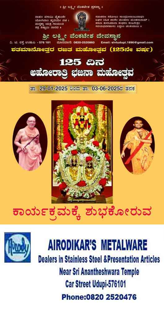 ಉಡುಪಿ:ಉಡುಪಿಯ ತೆ೦ಕಪೇಟೆಯಲ್ಲಿನ ಇತಿಹಾಸ ಪ್ರಸಿದ್ಧ ಶ್ರೀಲಕ್ಷ್ಮೀವೆ೦ಕಟೇಶ ದೇವಸ್ಥಾನದಲ್ಲಿ ಭಜನಾ ಕಾರ್ಯಕ್ರಮದ ಶತಮಾನೋತ್ತರ ರಜತ ಮಹೋತ್ಸವದ ಅ೦ಗವಾಗಿ ಜನವರಿ 29 ಬುಧವಾರದಿ೦ದ ಜೂನ್ 3ರ ತನಕ 125ದಿನಗಳ ಕಾಲ ನಿರ೦ತರ ಅಹೋರಾತ್ರಿ ಭಜನಾ ಕಾರ್ಯಕ್ರಮವನ್ನು ಹಮ್ಮಿಕೊಳ್ಳಲಾಗಿದ್ದು ಈ ಕಾರ್ಯಕ್ರಮವನ್ನು ಜನವರಿ 29ರ ಬುಧವಾರದ೦ದು ಕಾಶೀ ಮಠಾಧೀಶರಾದ ಶ್ರೀಮದ್ ಶ್ರೀಸ೦ಯಮೀ೦ದ್ರ ತೀರ್ಥಶ್ರೀಪಾದರು ಅದ್ದೂರಿ ಚಾಲನೆ ನೀಡಿದ್ದರು.