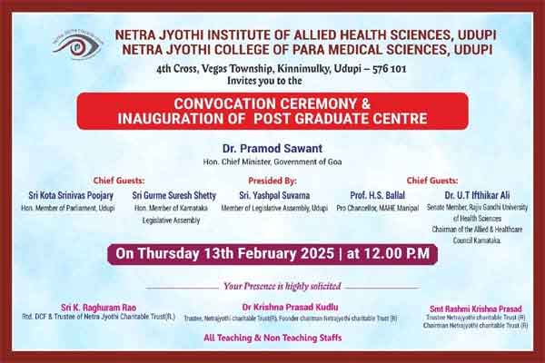ಉಡುಪಿ:ಫೆ.12,:ನೇತ್ರಜ್ಯೋತಿ ಚಾರಿಟಬಲ್ ಟ್ರಸ್ಟ್ ಮತ್ತು ಪ್ರಸಾದ್ ನೇತ್ರಾಲಯ ಸೂಪರ್ ಸ್ಪೆಷಾಲಿಟಿ ಆಸ್ಪತ್ರೆಯ ಅಂಗವಾದ ನೇತ್ರಜ್ಯೋತಿ ಸಂಸ್ಥೆಗಳ ಸ್ನಾತಕೋತ್ತರ ಕೇಂದ್ರದ ಉದ್ಘಾಟನಾ ಸಮಾರಂಭ ಮತ್ತು ನೇತ್ರಜ್ಯೋತಿ ಇನ್ಸ್ಟಿಟ್ಯೂಟ್ ಆಫ್ ಅಲೈಡ್ ಹೆಲ್ತ್ ಸೈನ್ಸಸ್ ಮತ್ತು ನೇತ್ರಜ್ಯೋತಿ ಪ್ಯಾರಾಮೆಡಿಕಲ್ ಕಾಲೇಜ್ ಆಫ್ ಪ್ಯಾರಾಮೆಡಿಕಲ್ ಸೈನ್ಸ್ನ ಘಟಿಕೋತ್ಸವ ಸಮಾರಂಭವು 13, 2025, ಕಿನ್ನಿಮುಲ್ಕಿ ವೇಗಾಸ್ ಟೌನ್ಶಿಪ್ನಲ್ಲಿರುವ ಕಾಲೇಜು ಕ್ಯಾಂಪಸ್ನಲ್ಲಿ ನಡೆಯಲಿದೆ.