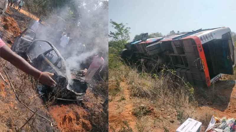 ಭೀಕರ ಅಪಘಾತದಲ್ಲಿ ಕಾರು ಬೆಂಕಿಯಿಂದ ಹೊತ್ತಿ ಉರಿದಿದ್ದರೆ, ಬಸ್ ಪಲ್ಟಿಯಾಗಿ ಉರುಳಿ ಬಿದ್ದಿದೆ. ಘಟನೆಯಲ್ಲಿ ಕಾರಿನಲ್ಲಿದ್ದ ಮದನಪಲ್ಲಿ ನಿವಾಸಿಗಳಾದ ಇಬ್ಬರು ಸುಟ್ಟು ಕರಕಲಾಗಿದ್ದರೆ, ಮೂವರಿಗೆ ಸಣ್ಣಪುಟ್ಟ ಗಾಯಗಳಾಗಿದ್ದು, ಅಪಾಯದಿಂದ ಪಾರಾಗಿದ್ದಾರೆ. ಸದ್ಯ ಗಾಯಾಳುಗಳನ್ನು ಆಸ್ಪತ್ರೆಗೆ ರವಾನಿಸಲಾಗಿದೆ. ಇನ್ನು ಖಾಸಗಿ ಬಸ್ನಲ್ಲಿ ಪ್ರಯಾಣಿಕರು ಬಚಾವಾಗಿದ್ದಾರೆ.