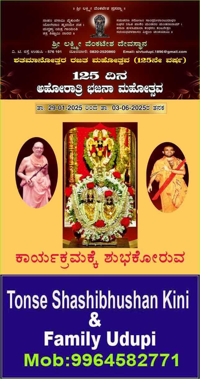 ಉಡುಪಿ:ಮಾ,31: ಶ್ರೀ ಲಕ್ಷ್ಮೀ ವೆಂಕಟೇಶ ದೇವಸ್ಥಾನ ತೆಂಕಪೇಟೆ ಉಡುಪಿ ಇಲ್ಲಿನ ಶತಮಾನೋತ್ತರ ರಜತ ಮಹೋತ್ಸವ 125 ವರ್ಷದ ಆಚರಣೆ ಪ್ರಯುಕ್ತ 125 ದಿನ ಅಹೋರಾತ್ರಿ ನಿರಂತರ ಭಜನಾ ಮೊಹೋತ್ಸವ ಕ್ಕೆ ಯುಗಾದಿಯ ಹಬ್ಬದ ಪರ್ವಕಾಲದಲ್ಲಿ ಸೋಮವಾರ ಶ್ರೀ ಕೈವಲ್ಯ ಮಠ ಸಂಸ್ಥಾನದ ಮಠಾಧಿಪತಿ ಶ್ರೀಮದ್ ಶಿವಾನಂದ ಸರಸ್ಪತಿ ಶ್ರೀಪಾದರು ದೇವಳಕ್ಕೆ ಭೇಟಿ ನೀಡಿದರು.