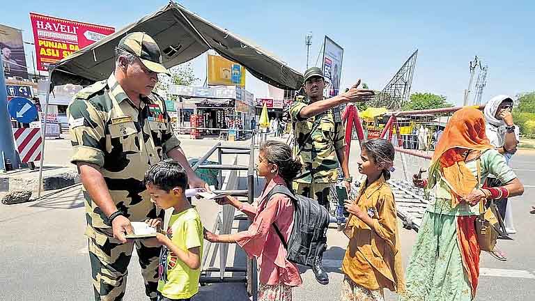 (ಬಿಎಸ್ಎಫ್ ಯೋಧರೊಬ್ಬರು ತಮ್ಮ ದೇಶಕ್ಕೆ ಗಡಿ ದಾಟಲು ಆಗಮಿಸುತ್ತಿರುವ ಪಾಕಿಸ್ತಾನಿ ಪ್ರಜೆಗಳ ದಾಖಲೆಗಳನ್ನು ಪರಿಶೀಲಿಸುತ್ತಿರುವುದು)