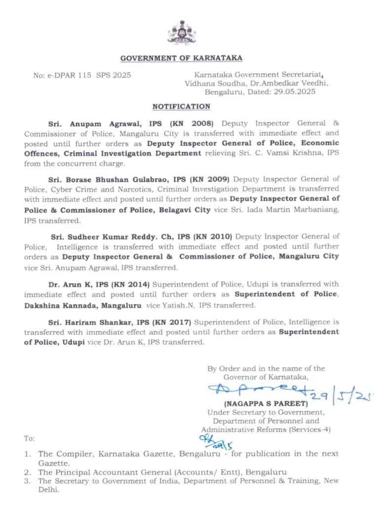 ಮಂಗಳೂರಿನ ಕಮಿಷನರ್ ಆಗಿ ಸುಧೀರ್ ಕುಮಾರ್ ರೆಡ್ಡಿ ಅವರನ್ನು ವರ್ಗಾವಣೆ ಮಾಡಲಾಗಿದೆ. ಹರಿರಾಮ್ ಶಂಕರ್ ಅವರನ್ನು ಉಡುಪಿ ಎಸ್ ಪಿ ಆಗಿ ವರ್ಗಾವಣೆ ಮಾಡಲಾಗಿದೆ. ಅನುಪಮ್ ಅಗರ್ವಾಲ್ ಅವರನ್ನು ಸಿಐಡಿ ಆರ್ಥಿಕ ಅಪರಾಧಗಳ ಡಿಐಜಿ ಆಗಿ ವರ್ಗಾವಣೆ ಮಾಡಲಾಗಿದೆ.