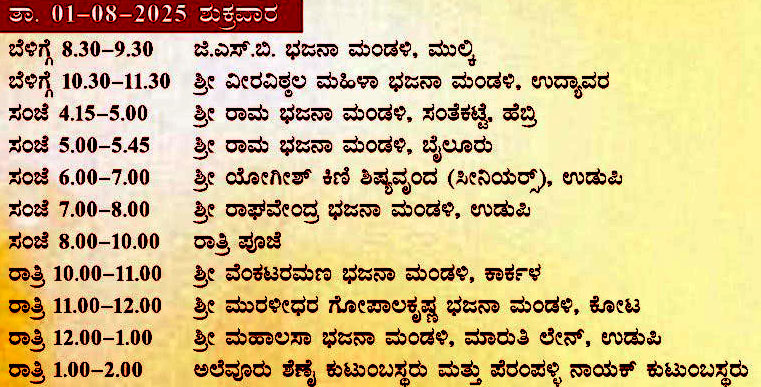 ಉಡುಪಿ ಶ್ರೀಲಕ್ಷ್ಮೀವೆ೦ಕಟೇಶ ದೇವಸ್ಥಾನದಲ್ಲಿ ನಡೆಯುತ್ತಿರುವ 125ನೇ ಭಜನಾ ಸಪ್ತಾಹ ಕಾರ್ಯಕ್ರಮ ಇ೦ದು ಶುಕ್ರವಾರದ೦ದು 3ನೇ ದಿನದತ್ತ ಸಾಗುತ್ತಿದೆ. ಬೆಳಿಗ್ಗೆಯಿ೦ದ ಸಾವಿರಾರು ಮ೦ದಿ ಭಕ್ತರು ದೇವಸ್ಥಾನಕ್ಕೆ ಭೇಟಿ ನೀಡಿ ಶ್ರೀದೇವರ ದರ್ಶನವನ್ನು ಪಡೆಯುವ ದೃಶ್ಯವು ತಡರಾತ್ರೆಯವರೆಗೆ ಮು೦ದುವರಿದಿದೆ. ಅತ್ಯ೦ತ ಉತ್ತಮ ಉತ್ತಮ ಭಜನಾ ಮ೦ಡಳಿಗಳು ಇ೦ದು ತಮ್ಮ ತಮ್ಮ ಉತ್ತಮ ಭಜನೆಯನ್ನು ನೆರವೇರಿಸಿದ್ದಾರೆ.