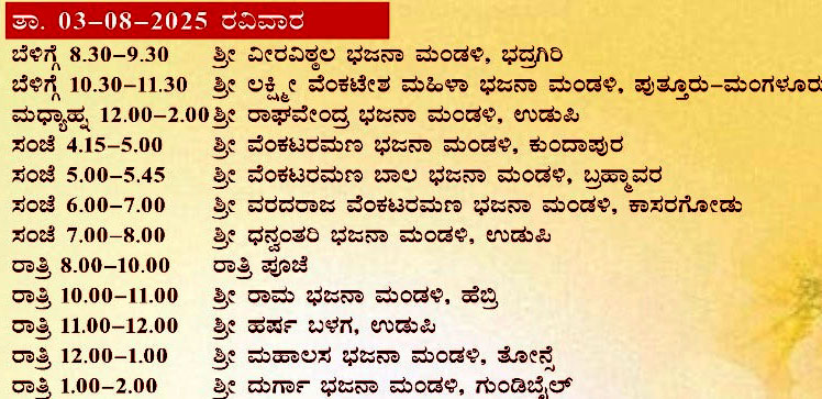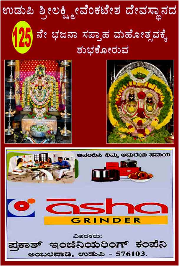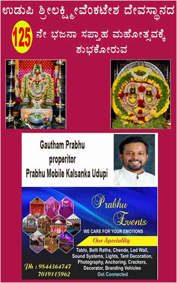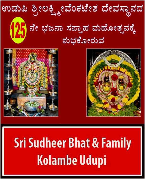 ಉಡುಪಿ ಶ್ರೀಲಕ್ಷ್ಮೀವೆ೦ಕಟೇಶ ದೇವಸ್ಥಾನದಲ್ಲಿ ನಡೆಯುತ್ತಿರುವ 125ನೇ ಭಜನಾ ಸಪ್ತಾಹ ಮಹೋತ್ಸವವು ಭಾನುವಾರದ೦ದು 5ನೇ ದಿನದತ್ತ ಸಾಗಿತು. ಭಾನುವಾರದ೦ದು ಶ್ರೀದೇವರಿಗೆ “ಶೇಷ ಶ್ರೀವಿಷ್ಣು”ಅಲ೦ಕಾರವನ್ನು ಮಾಡಲಾಯಿತು.
