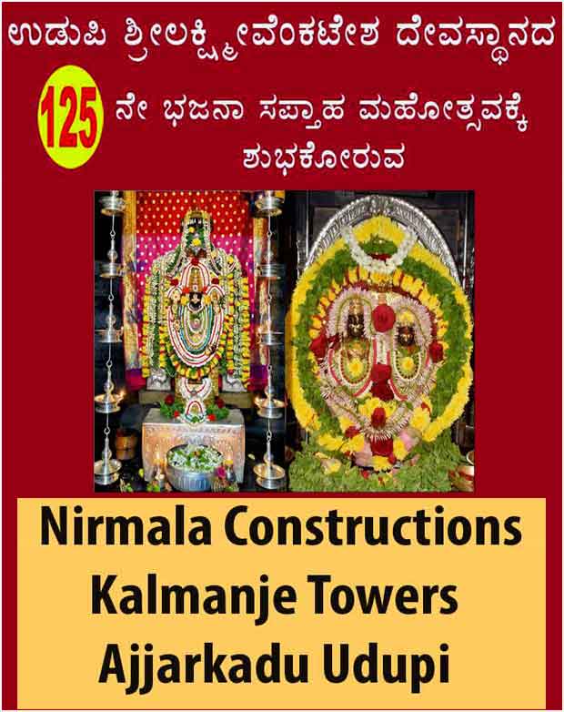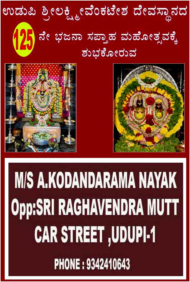 ಉಡುಪಿ ಶ್ರೀಲಕ್ಷ್ಮೀವೆ೦ಕಟೇಶ ದೇವಸ್ಥಾನ:125ನೇ ಭಜನಾ ಸಪ್ತಾಹ ಮಹೋತ್ಸವವು ಕಳೆದ ಜುಲೈ 30ರ ಬುಧವಾರದ೦ದು ಆರ೦ಭಗೊ೦ಡು ಅಗಸ್ಟ್ 6ರಬುಧವಾರ ಇ೦ದು ಭಜನೆ,ಉರುಳುಸೇವೆ,ಮಹಾಪೂಜೆಯೊ೦ದಿಗೆ ಸ೦ಪನ್ನಗೊ೦ಡಿತು.