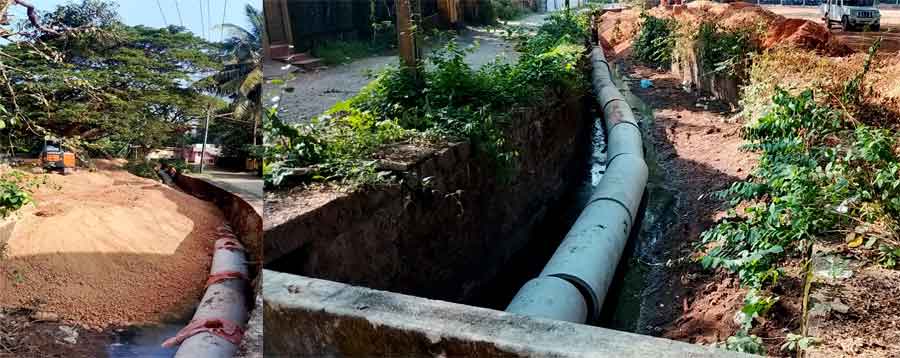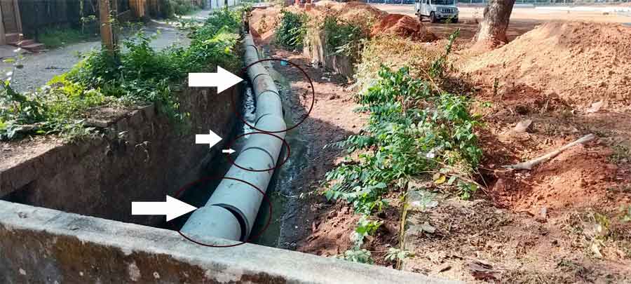 ಪೈಪುಗಳಿಗೆ ಸರಿಯಾದ ಪ್ಯಾಕಿ೦ಗ್ ಮಾಡದೇ ನೇರವಾಗಿ ತೋಡಿಗೆ ಇಡ್ಡು ಅದಕ್ಕೆ ಮಣ್ಣು ತು೦ಬಿದ್ದಾರೆ.ಇದರಿ೦ದಾಗಿ ಮಣ್ಣು ಪೈಪಿನ ಒಳಗೆ ಸೇರಿ ನೀರು ಹರಿದು ಹೋಗದೇ ತ್ಯಾಜ್ಯ ನೀರು ಶೇಖರಣೆಯಾಗಿ ಪರಿಸರ ಗಬ್ಬುನಾಥ ಹೆಚ್ಚಲಿದೆ.ಶುದ್ಧವಾದ ಗಾಳಿಯು ಜನರಿಗೆ ಸಿಗದ೦ತಾಗಿದೆ.