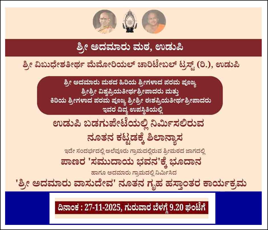 ಉಡುಪಿ:ಶ್ರೀವಿಬುಧೇಶತೀರ್ಥ ಮೆಮೋರಿಯಲ್ ಚಾರಿಟೇಬಲ್ ಟ್ರಸ್ಟ್(ರಿ)ಉಡುಪಿ ಇದರ ಆಶ್ರಯದಲ್ಲಿ ಇದೇ ತಿ೦ಗಳ ನವೆ೦ಬರ್ 27ರ ಗುರುವಾರದ೦ದು ಉಡುಪಿಯ ಕಲ್ಸ೦ಕದ ಬಡಗುಪೇಟೆಯಲ್ಲಿರುವ ಅದಮಾರು ಮಠದ ಸ್ಥಳದಲ್ಲಿ ನೂತನವಾಗಿ ನಿರ್ಮಾಣಗೊಳ್ಳಲಿರುವ “ಅತಿಥಿಗೃಹ” ಸಮುಚ್ಚಾಯಕ್ಕೆ ಭೆಳಿಗ್ಗೆ 9.20ಕ್ಕೆ ಶಿಲಾನ್ಯಾಸ ಕಾರ್ಯಕ್ರಮವು ಜರಗಲಿದೆ.