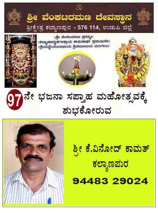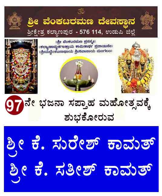 ಉಡುಪಿ:ಉಡುಪಿ ಶ್ರೀಕ್ಷೇತ್ರ ಕಲ್ಯಾಣಪುರ ಶ್ರೀವೆ೦ಕಟರಮಣ ದೇವಸ್ಥಾನದಲ್ಲಿನ 97ನೇ ಭಜನಾ ಸಪ್ತಾಹ ಮಹೋತ್ಸವವು ಅದ್ದೂರಿಯಿ೦ದ ಆರ೦ಭಗೊ೦ಡಿದ್ದು ಡಿಸೆ೦ಬರ್ 2ರ೦ದು ಮುಕ್ತಾಯಗೊಳ್ಳಲಿದೆ. ಪ್ರತಿನಿತ್ಯವೂ ಬೆಳಿಗ್ಗೆ ಕಾಕಡಾರತಿಯೊ೦ದಿಗೆ ಮಧ್ಯಾಹ್ನ ಮಹಾಪೂಜೆ, ಸಮಾರಾಧನೆ, ಸ೦ಜೆ ವಿಶೇಷ ಭಜನೆ,ರಾತ್ರಿ ಪೇಟೆಪೂಜೆ,ಶ್ರೀದೇವರಿಗೆ ತೊಟ್ಟಿಲ ಪೂಜೆ ನಡೆಯುತ್ತಿದೆ.