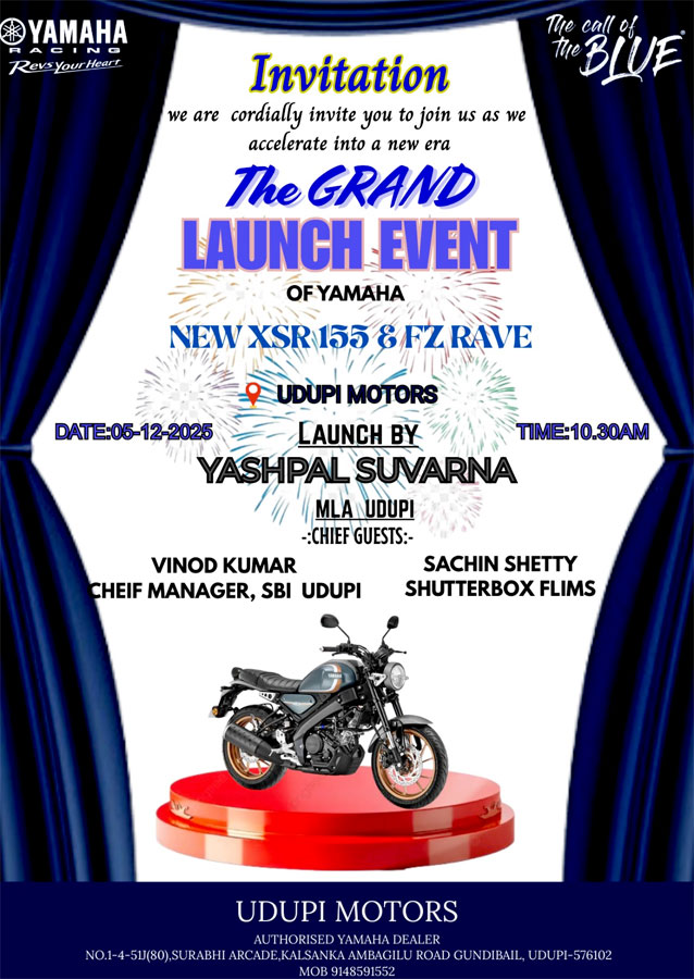 ಕಲ್ಸಂಕ-ಗುಂಡಿಬೈಲು ರಸ್ತೆಯ ಸುರಭಿ ಆರ್ಕೇಡ್ ನಲ್ಲಿರುವ ಯಮಹ ಅಧಿಕೃತ ಡೀಲರ್ ಉಡುಪಿ ಮೋಟಾರ್ಸ್ ನಲ್ಲಿ ನಡೆಯುವ ಸಮಾರಂಭದಲ್ಲಿ ಉಡುಪಿ ಶಾಸಕ ಯಶ್ ಪಾಲ್ ಸುವರ್ಣ ಅವರು XSR 155 ಹಾಗೂ FZ ರೇವ್ ಬೈಕುಗಳನ್ನು ಬಿಡುಗಡೆಗೊಳಿಸಲಿದ್ದಾರೆ.