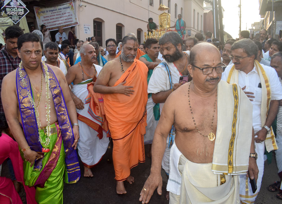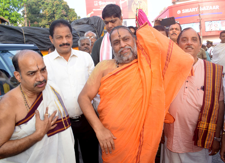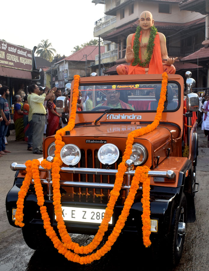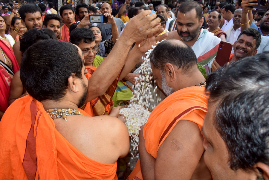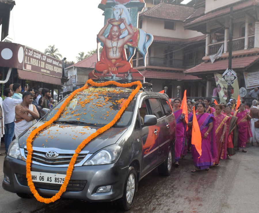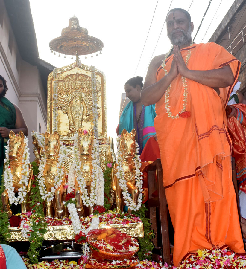 ಮಂತ್ರಾಲಯ ಮಠಾಧೀಶರಾದ ಶ್ರೀ ಸುಬುಧೇಂದ್ರತೀರ್ಥ ಶ್ರೀಪಾದರು ಪುಷ್ಪಾರ್ಚನೆ ಮಾಡುವುದರ ಮೂಲಕ ಮೆರವಣಿಗೆಗೆ ಚಾಲನೆ ನೀಡಿದರು.