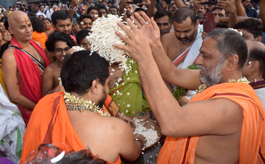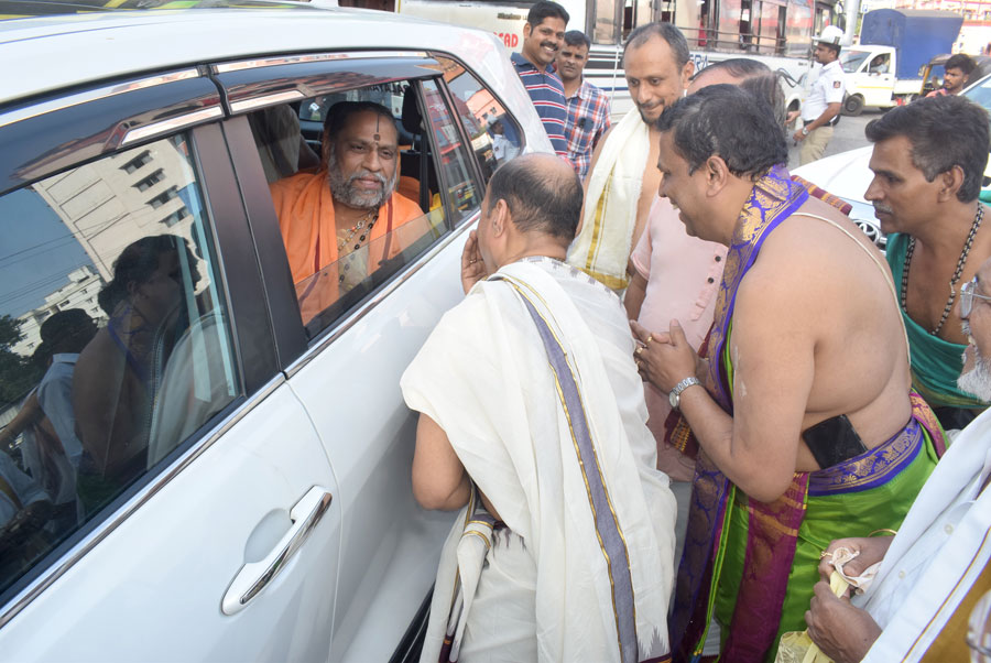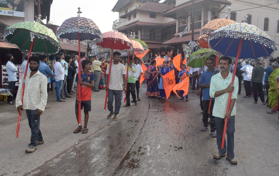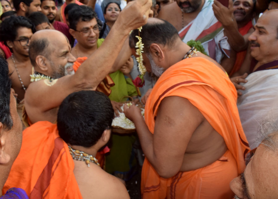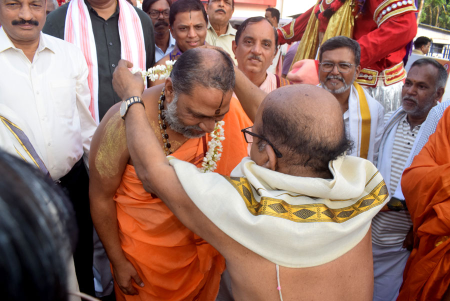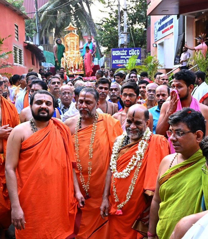 ಮಂತ್ರಾಲಯ ಮಠಾಧೀಶರಾದ ಶ್ರೀ ಸುಬುಧೇಂದ್ರತೀರ್ಥ ಶ್ರೀಪಾದರು ಪುಷ್ಪಾರ್ಚನೆ ಮಾಡುವುದರ ಮೂಲಕ ಮೆರವಣಿಗೆಗೆ ಚಾಲನೆ ನೀಡಿದರು.