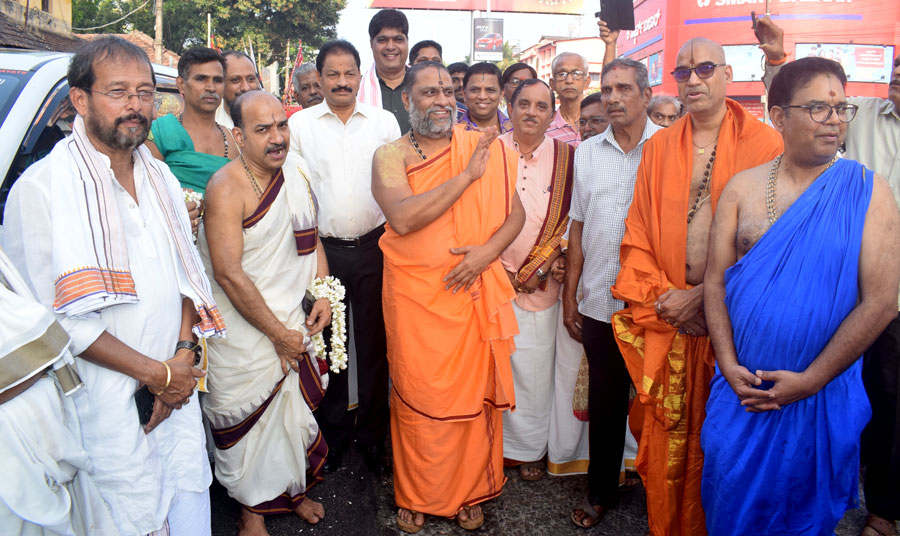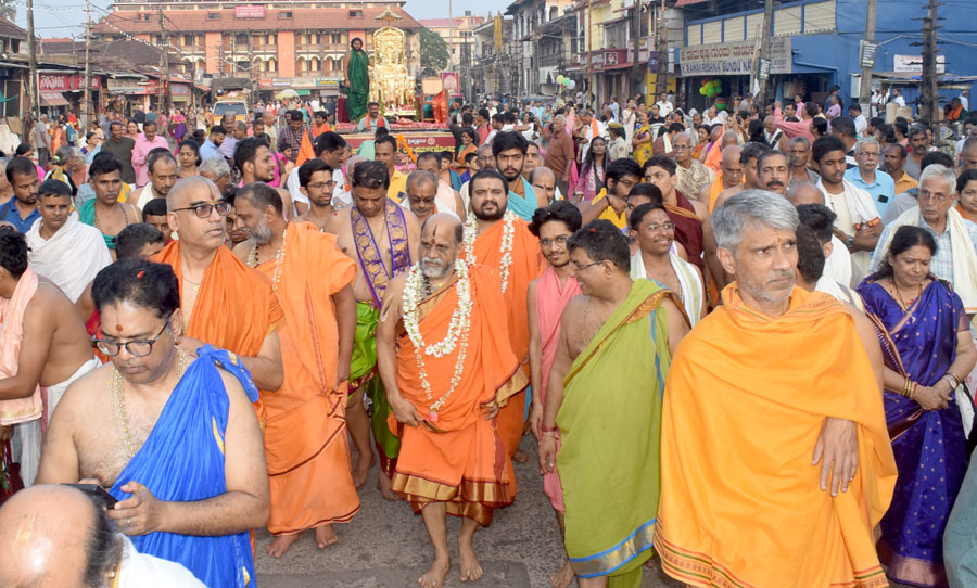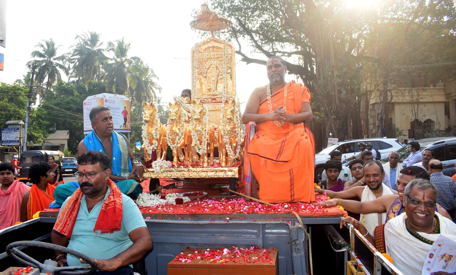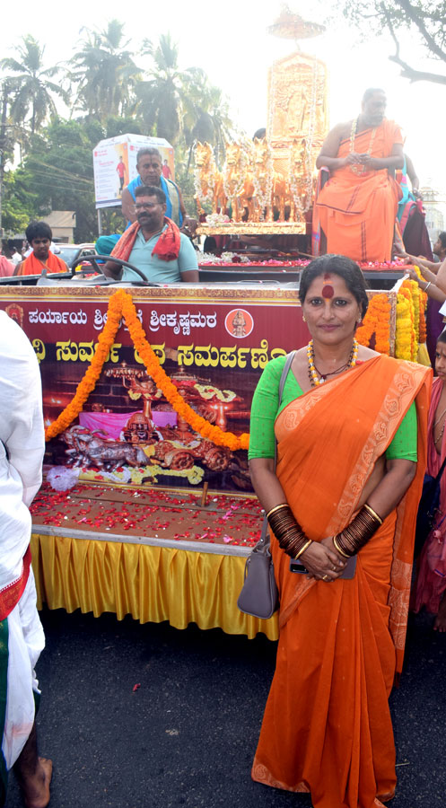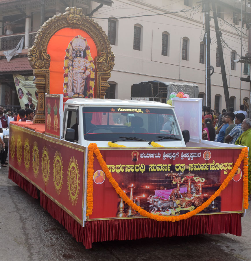 ಉಡುಪಿ: ಪರ್ಯಾಯ ಶ್ರೀ ಪುತ್ತಿಗೆ ಮಠದ ಶ್ರೀ ಸುಗುಣೇಂದ್ರತೀರ್ಥ ಶ್ರೀಪಾದರ ಸನ್ಯಾಸಾಶ್ರಮ ಸ್ವೀಕಾರದ 50ನೇ ವರ್ಷದ ನಿಮಿತ್ತವಾಗಿ ಶ್ರೀ ಕೃಷ್ಣನಿಗೆ ಪಾರ್ಥಸಾರಥಿ ಸುವರ್ಣ ರಥ ಸಮರ್ಪಣೆ ಕಾರ್ಯಕ್ರಮ ನಡೆಯಿತು. ಉಡುಪಿಯ ಜೋಡುಕಟ್ಟೆಯಿಂದ ರಥಬೀದಿಯವರೆಗೆ ಮೆರವಣಿಗೆ ಮೂಲಕ ರಥವನ್ನು ರಾಜಾಂಗಣಕ್ಕೆ ತರಲಾಯಿತು.