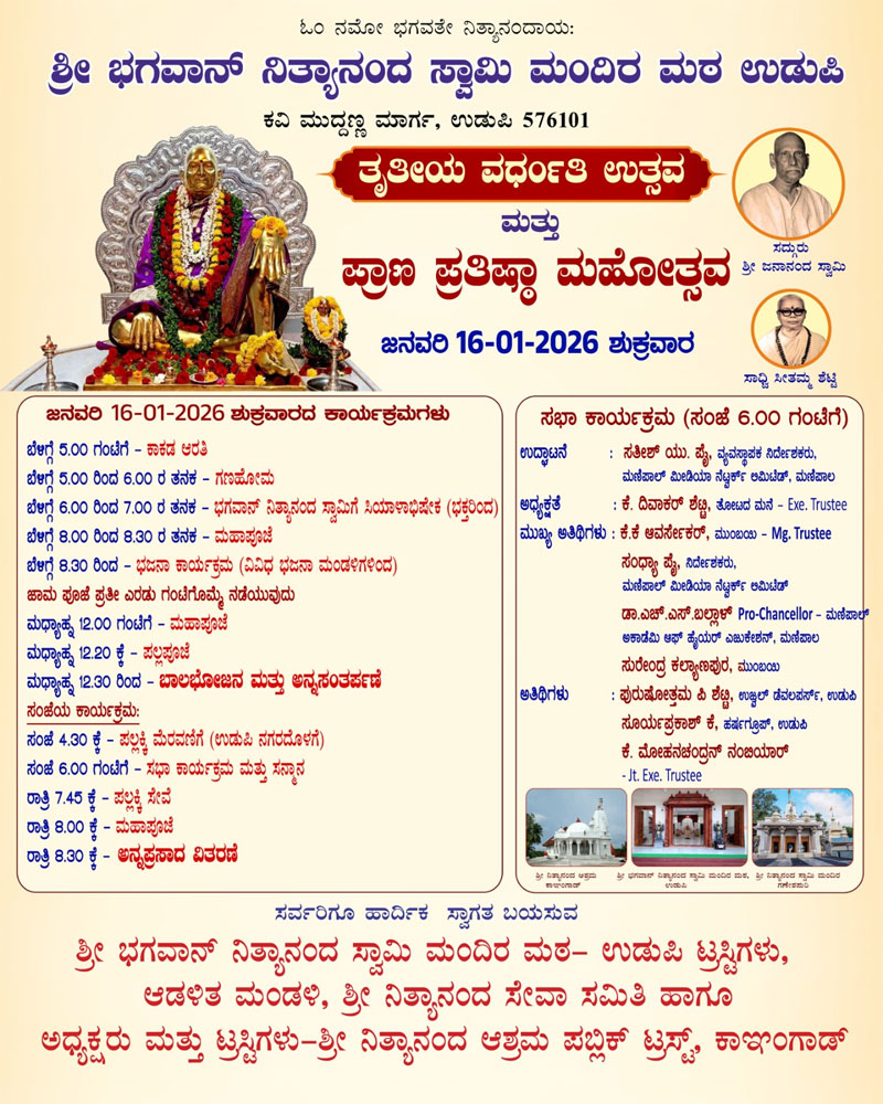 ಉಡುಪಿ:ಭಗವನ್ ನಿತ್ಯಾನ೦ದ ಸ್ವಾಮಿ ಮ೦ದಿರ ಮಠ ಉಡುಪಿ ಇದರ ತೃತೀಯ ವರ್ಧ೦ತಿ ಮಹೋತ್ಸವವು ಜನವರಿ 16ರ ಶುಕ್ರವಾರದ೦ದು ಜರಗಲಿದ್ದು ಈ ಕಾರ್ಯಕ್ರಮಕ್ಕಾಗಿ ಸಕಲ ಸಿದ್ದತೆಯನ್ನು ಮ೦ದಿರ ಮಠದ ಟ್ರಸ್ಟಿಗಳು ಹಾಗೂ ಆಡಳಿತ ಮ೦ಡಳಿಯ ಅಧ್ಯಕ್ಷರು ಹಾಗೂ ಸರ್ವ ಪದಾಧಿಕಾರಿಗಳು ನಡೆಸಿದ್ದಾರೆ.