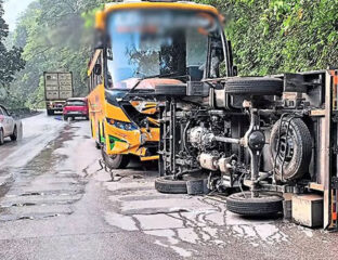 ಪುತ್ತೂರು: ರಾಷ್ಟ್ರೀಯ ಹೆದ್ದಾರಿ 75 ರ ಶಿರಾಡಿ ಘಾಟ್ ಪರಿಸರದ ಕೆಂಪಳ್ಳ ಬಳಿ ಚಾಲಕನ ನಿಯಂತ್ರಣ ತಪ್ಪಿ ಸರಕು ಸಾಗಿಸುತ್ತಿದ್ದ ಟೆಂಪೊ ಪಲ್ಟಿಯಾಗಿ, ಹೆದ್ದಾರಿಯ ಇನ್ನೊಂದು ಬದಿಯಲ್ಲಿ ಬರುತ್ತಿದ್ದ ಖಾಸಗಿ ಬಸ್ಸಿಗೆ ಡಿಕ್ಕಿ ಹೊಡೆದ ಘಟನೆ ಶುಕ್ರವಾರ ನಡೆದಿದೆ. ಈ ಅಪಘಾತದಲ್ಲಿ ಟೆಂಪೊ ಚಾಲಕ ಗಾಯಗೊಂಡಿದ್ದು, ಘಟನೆಯಲ್ಲಿ ಬಸ್ಸಿನ ಮುಂಭಾಗ