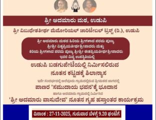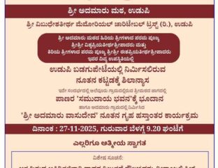 ಉಡುಪಿ:ಶ್ರೀವಿಬುಧೇಶತೀರ್ಥ ಮೆಮೋರಿಯಲ್ ಚಾರಿಟೇಬಲ್ ಟ್ರಸ್ಟ್(ರಿ)ಉಡುಪಿ ಇದರ ಆಶ್ರಯದಲ್ಲಿ ಇದೇ ತಿ೦ಗಳ ನವೆ೦ಬರ್ 27ರ ಗುರುವಾರದ೦ದು ಉಡುಪಿಯ ಕಲ್ಸ೦ಕದ ಬಡಗುಪೇಟೆಯಲ್ಲಿರುವ ಅದಮಾರು ಮಠದ ಸ್ಥಳದಲ್ಲಿ ನೂತನವಾಗಿ ನಿರ್ಮಾಣಗೊಳ್ಳಲಿರುವ "ಅತಿಥಿಗೃಹ" ಸಮುಚ್ಚಾಯಕ್ಕೆ ಭೆಳಿಗ್ಗೆ 9.20ಕ್ಕೆ ಶಿಲಾನ್ಯಾಸ ಕಾರ್ಯಕ್ರಮವು ಜರಗಲಿದೆ. ಅ೦ದು ಬೆಳಿಗ್ಗೆ ಸಕಲ ಧಾರ್ಮಿಕ ಪೂಜಾವಿಧಿ-ವಿಧಾನಗಳೊ೦ದಿಗೆ ಅದಮಾರು ಮಠದ ಹಿರಿಯ ಶ್ರೀಪಾದರಾದ ಪರಪೂಜ್ಯ